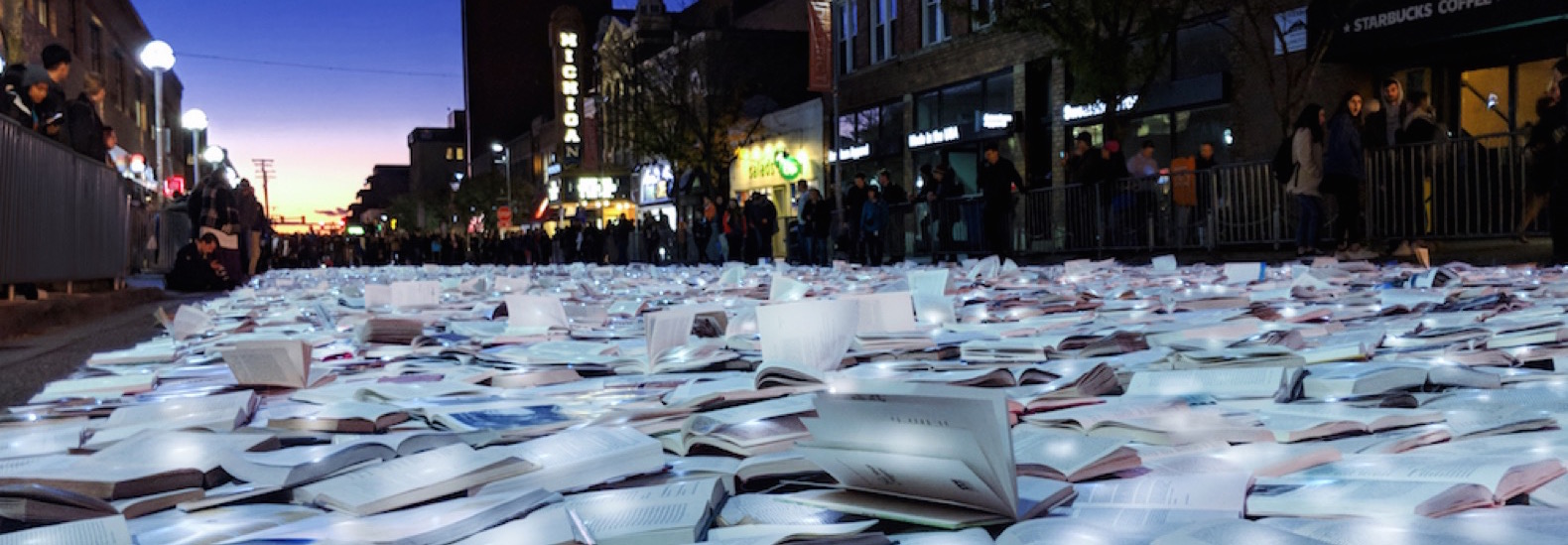 Literature vs Traffic’in son entalasyonlarında, İspanyol tasarım kolektif luzinterruptus,  Ann Arbor, Michigan’da büyük bir caddeyi, 11 bin kitapla parıldayan bir nehre dönüştürdü. Yaya dostu alanların önemine dikkat çekmek için yapılan dev kurulum, normal zamanlardaki araba sesleri ve kirliliğinden tamamen sessiz bir bölgeye dönüştü. Gecenin sonunda, tüm kitaplar hızlı bir şekilde “geri dönüştürüldü” ve yaşanan olayın hatırası olarak ziyaretçiler tarafından eve götürüldü.