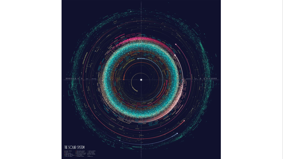 Güneş sistemi haritası yaklaşık 10.000 asteroit ve 8.000 başka nesne dahil olmak üzere 18.000’den fazla gök cismini gösteriyor. Harita, Washington Üniversitesi’nde biyoloji adayı olan doktoralı Eleanor Lutz tarafından hazırlandı. Lutz’un Tabletop Whale adında bir de blogu var. Harita her bir asteroidin 1999’un yılbaşı gecesi bulunduğu yeri gösteriyor.