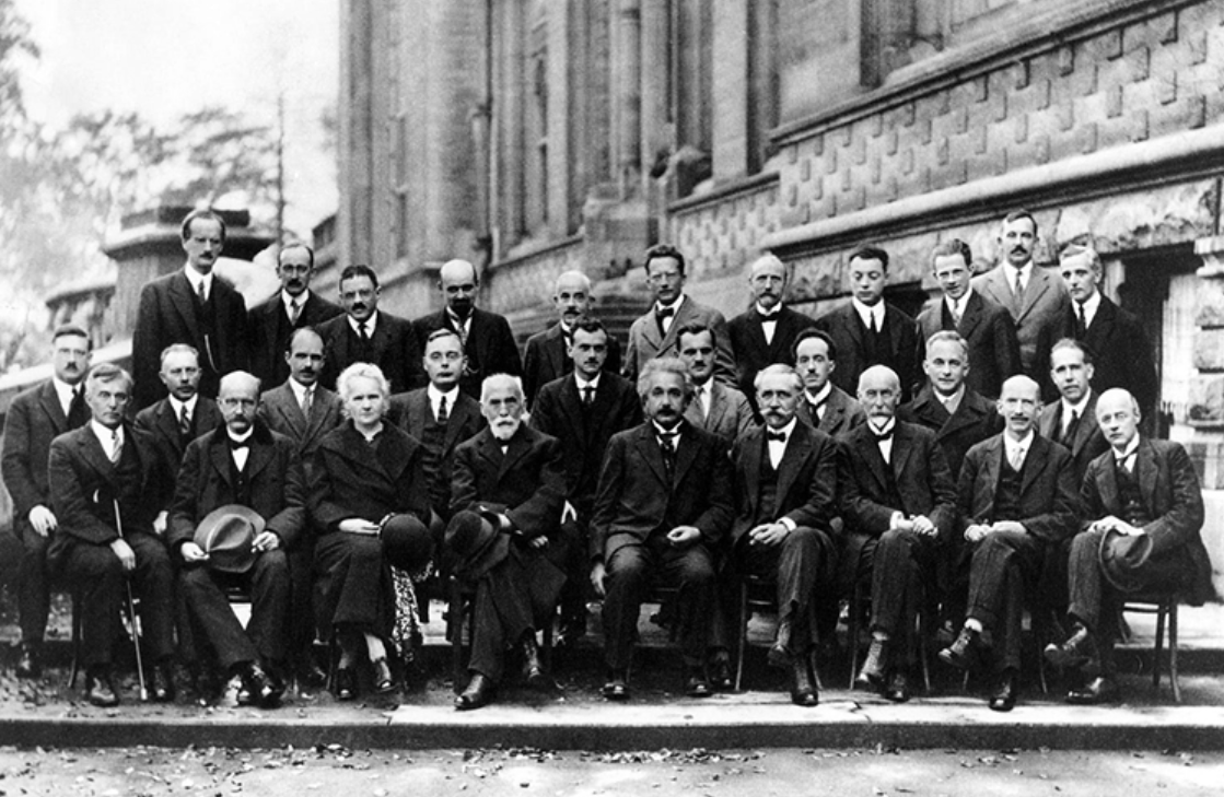 Kuantum Mekaniği üzerine Beşinci Solvay Konferansı, 1927, Brüksel. Benjamin Couprie’nin fotoğrafı. Arka sıradan öne, soldan sağa: Auguste Piccard, Émile Henriot, Paul Ehrenfest, Édouard Herzen, Théophile de Donder, Erwin Schrödinger, Jules-Émile Verschaffelt, Wolfgang Pauli, Werner Heisenberg, Ralph Howard Fowler, Léon Brillouin, Peter Debye, Martin Knudsen, William Lawrence Bragg, Hendrik Anthony Kramers, Paul Dirac, Arthur Compton, Louis de Broglie, Max Born, Niels Bohr, Irving Langmuir, Max Planck, Marie Skłodowska Curie, Hendrik Lorentz, Albert Einstein, Paul Langevin, Charles-Eugène Guye, Charles Thomson Rees Wilson, Owen Willans Richardson. (fotoğraf: Wikimedia Commons [Public domain])