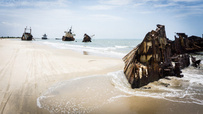 Kıyamet sonrası Hollywood gerilim filminin setinde olmak gibi görünen sahildeki gemilerin bir kısmı gelgitte onlara ulaşabileceğiniz kadar yakın, diğerleri ise okyanus yüzeyinde paslanmış bir direk ya da köprüden ibaret.