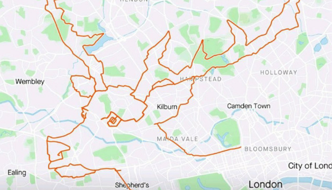 Adam düzenli olarak bisiklet sürerek bir fitness uygulamasında çeşitli çizimler oluşturuyor ve kısa süre önce Londra’da yaklaşık 9 saat boyunca bisiklet sürerek bir ren geyiğinin inanılmaz bir resmini yaptı.