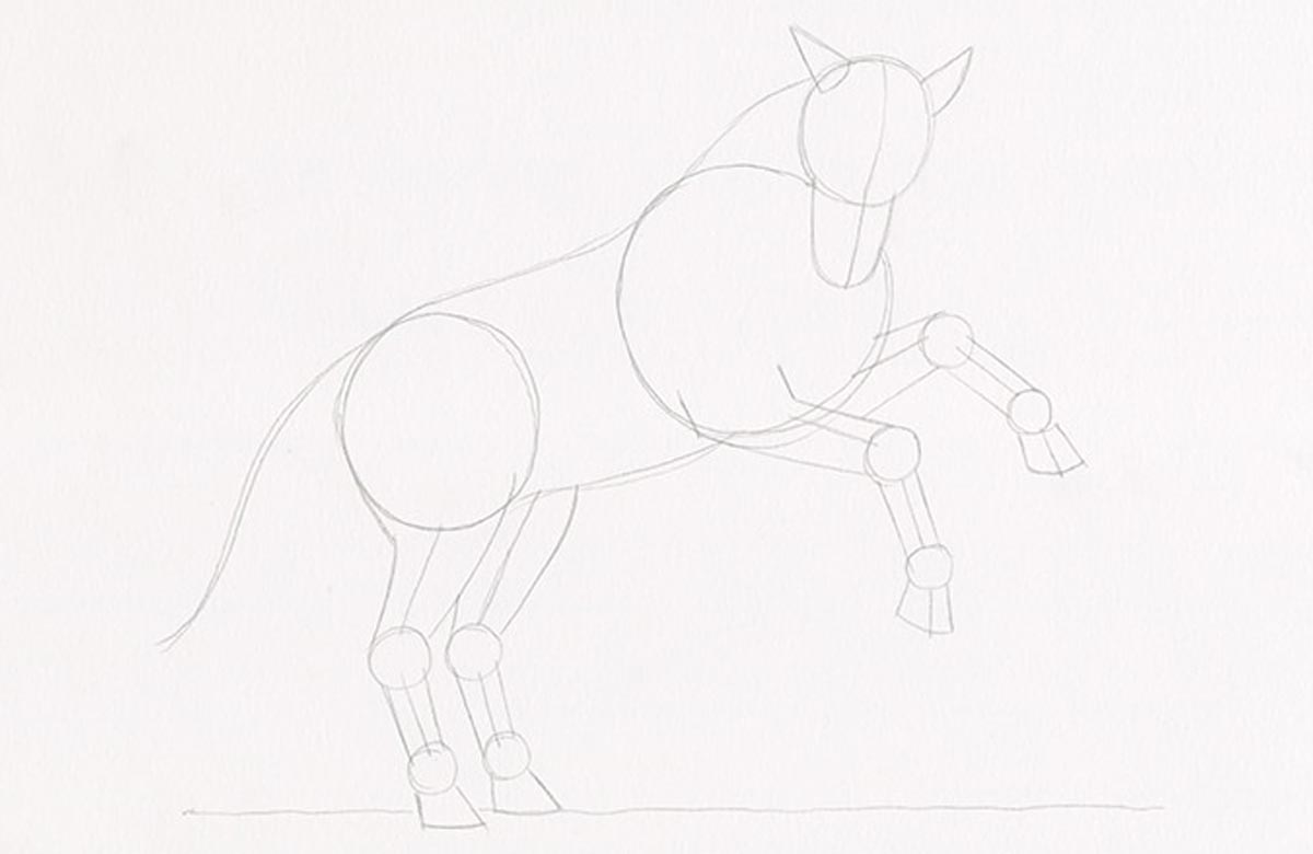 Daha sonra, atın bacakları için ortaya koyduğumuz şekilleri ve çizgileri birleştireceğiz. Henüz mükemmel hale getirme konusunda acele etmeyin, sadece doğru temeli atmaya odaklanın. Şu anda atın başının üstünde, kulakları olacak iki üçgen benzeri şekil çizebilirsiniz.