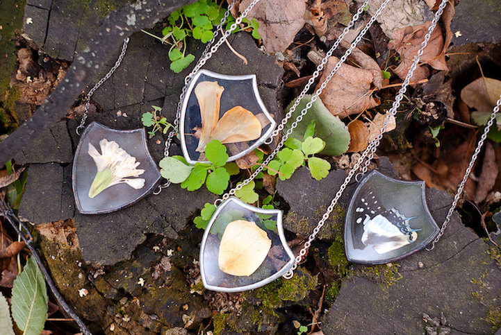 Dublinli yaratıcı-girişimci bunu yaparken, açık havada topladığı çiçekleri ve yaprakları en ince ayrıntısına kadar korumak için onlar dümdüz şekilde bastırıyor. Daha sonra, kurutulmuş malzemeleri camların arasına yerleştiriyor ve metalle mühürlüyor.