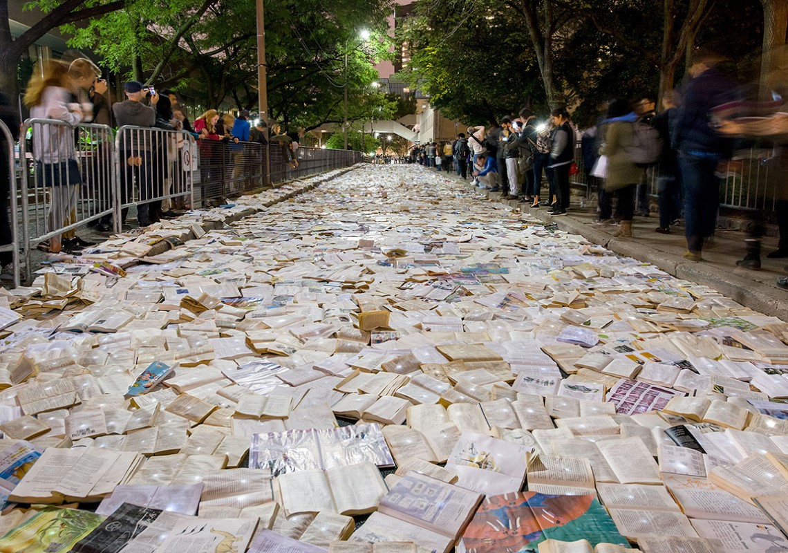 50’den fazla gönüllünün bağışladığı 10 bin kitaptan oluşan enstalasyon, sokaktan geçen insanlara her gün kullandıkları yolu ve trafiğin kötü etkilerini sorgulama olanağı tanıyor. Luzinterruptus sanatçıları ise yaptıkları açıklamada edebiyatın sokaklara egemen olmasını ve insanlara trafiksiz alanlar sunulmasını istediklerini belirttiler.