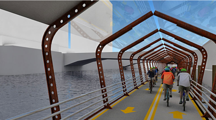 RiverRide adlı yüzen bisiklet yolları, bisikletli insanlara yollarının bir kısmını gerçekten arabasız bir yer verir ve sonra var olan bisiklet şeritleriyle birleşirler.