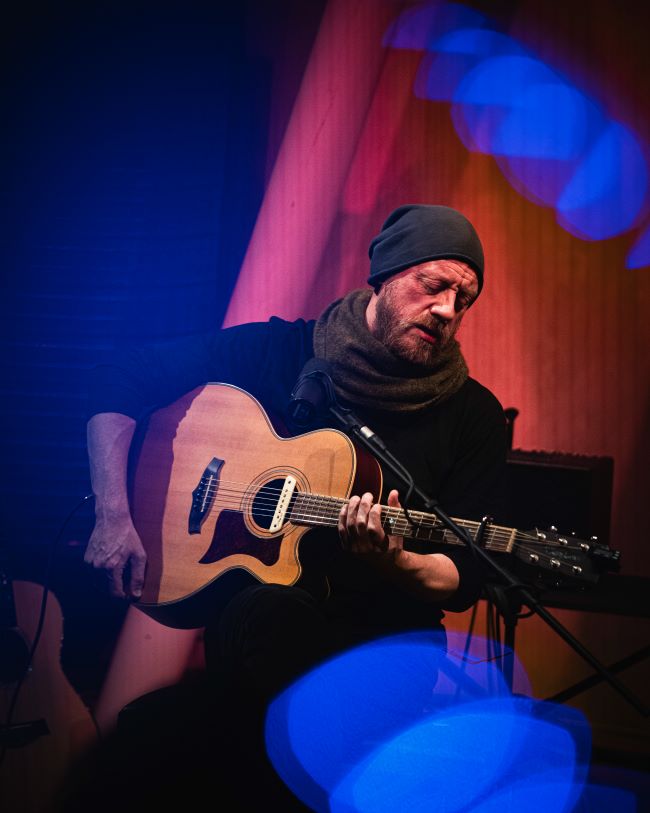 Çok da bekletmiyor hani! Beresi, kaşkolü ve elinde kahve fincanıyla sahneye adım atıyor. Ufak bir baş hareketiyle kaçamak bir selam atıp taburesine oturup gitarı eline alıyor. Sanki şarkı kayıtları sırasında stüdyoda verilen bir kahve molası sonrası kaldığı yerden devam etmek için geçiyor mikrofon başına. Bu nevi bir içtenlik bir doğallık var üzerinde. Hadi başlayalım.