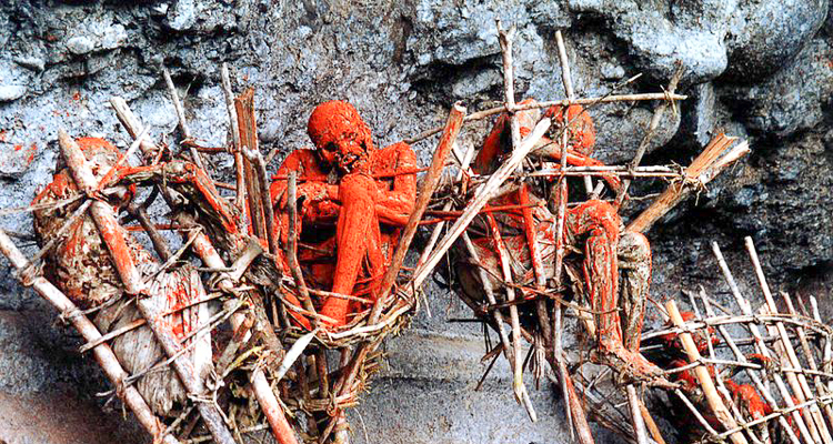 Anga kabilesinin mumyaları açıkta bırakılır, genellikle yüksek bir uçurumun üzerinde asılıdırlar ve onlar bir zamanlar yaşadıkları köye yüksekten bakarlar.