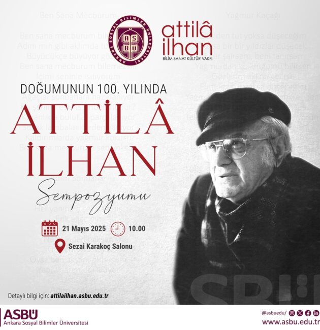 Attilâ İlhan Bilim Sanat Kültür Vakfı ve Ankara Sosyal Bilimler Üniversitesi işbirliğiyle “Doğumunun 100. Yılında Attilâ İlhan Sempozyumu” düzenleniyor. 21 Mayıs 2025 tarihindeki sempozyumda Attilâ İlhan’a dair kapsamlı oturumlar gerçekleştirilecek.