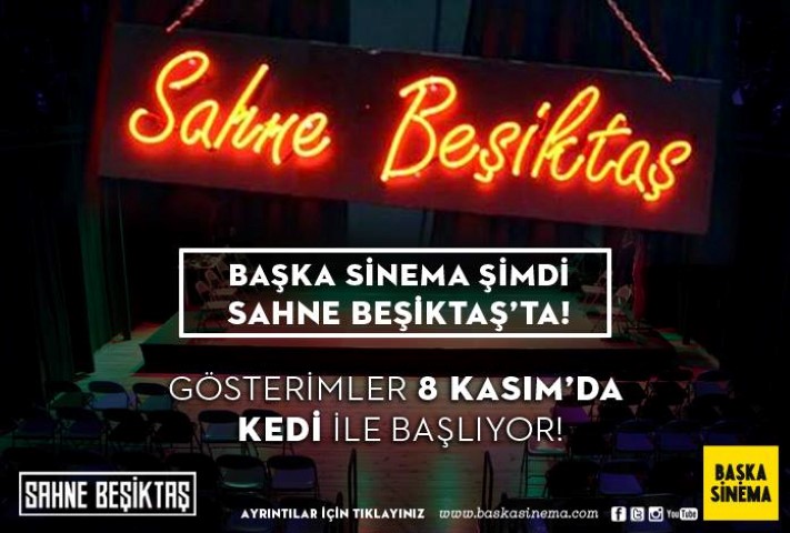 Kendine salon bulmakta zorlanan filmleri sinemaseverlerle buluşturan Başka Sinema, İstanbul’daki gösterim mekânları arasına Sahne Beşiktaş’ı da ekledi. Sahne Beşiktaş’taki gösterimler 8 Kasım Çarşamba günü saat 20:30’da Ceyda Torun’un yönetmenliğini yaptığı ‘Kedi’ adlı belgesel ile başlayacak. Tam biletin 25 TL, öğrenci biletinin 15 TL olarak belirlendiği gösterim, yanında kedi maması getiren izleyiciler için ise ücretsiz olacak. Mama bağışlamak isteyen seyircilerin 0212 259 10 45 numaralı telefonu arayarak rezervasyon yaptırması gerekiyor.
