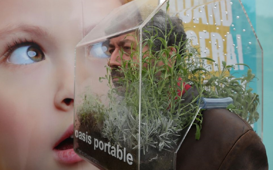 Reuters’ın haberine göre, Belçikalı sanatçı ve sosyal hizmet uzmanı Alain Verschueren, “portatif bir vaha” giyerek başkent Brüksel’de dolaşıyor; Omuzlarında duran, içindeki aromatik bitkilerden arındırılmış bir hava kabarcığı içinde onu kozalayan pleksiglas mini bir sera.