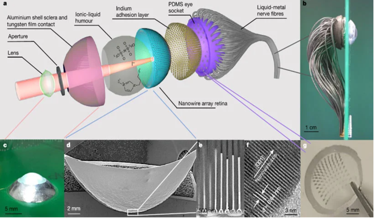İnsan retinasında (doğal) bulunan fotoreseptör hücrelerini taklit eden fotosensörlerle dolu bu yarım küre şeklindeki retina elektrik sinyalleri formundaki bilgileri fotosensörlerden bir dizi küçük nanotel ile iletiliyor. Sıvı bir metalden yapılan ve yumuşak kauçuk tüplere kapatılmış bu teller insan gözünde bulunan sinir liflerinin yerini alıyor.
