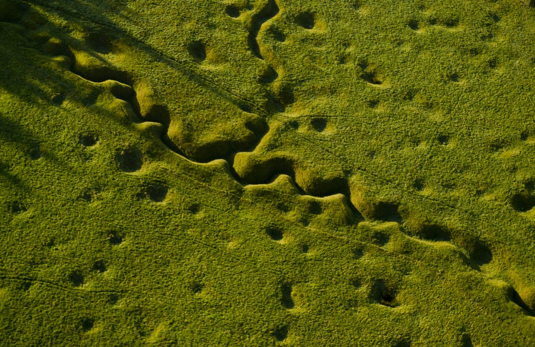 İrlandalı manzara fotoğrafçısı Michael St. Maur Sheil tarafından çekilen, Battle of the Somme sitesindeki bu fotoğrafta, çimlerle kaplanmış siperleri ve bombaların meydana getirdiği izleri görebilirsiniz. Bir milyondan fazla erkek savaşın ilk büyük İngiliz saldırısında yaralandı ya da öldürüldü. “ Almanlar kireç taşından kayaya kazılmış derin bir sığınağın içinde oturmuştu. Düz alanda ilerleyen İngiliz askerleri kolay bir hedefti, ” diyor Sheil.  Sheil’in “Fields of Battle – Lands of Peace” adlı sergisi bu aralar Lüksemburg Bahçelerinin çitleri boyunca Paris’te sergileniyor ve sonra da İngiltere’ye taşınacak. Savaşın kalıcı peyzajını kayıt altına almak için oluşturulan projede 79 çağdaş fotoğraf yer alıyor.