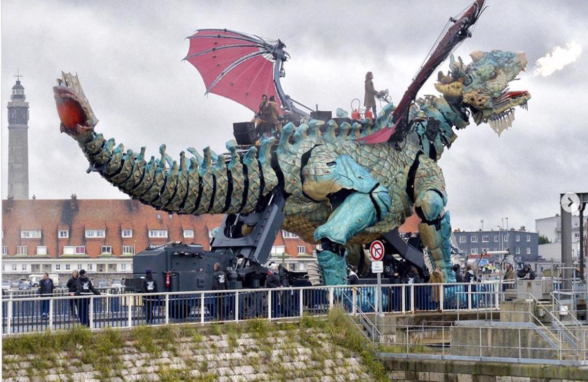 Çelik ve oyma ahşaptan yapılan dev ejderha, La Machine’in bugüne kadarki en büyük eseri. Bu ayın başlarında (1-3 Kasım), Calais sokaklarını her gün 17 kişi tarafından elle çalıştırılarak bir sanat festivalinin parçası oldu. Sokaklarda durup ateşli bir duman üflerken insan kalabalığı da efsanevi canavarın huşu içinde izledi. Yapımcılar, “Yeraltı dünyasından kurtulmuş olan Calais Ejderhası şehre gidiyor. La Machine Company tarafından yapılan bu yeni eser kendisine hayat veren 17 kişi tarafından manipüle edilerek şehri dolaşacak,” diyor.
