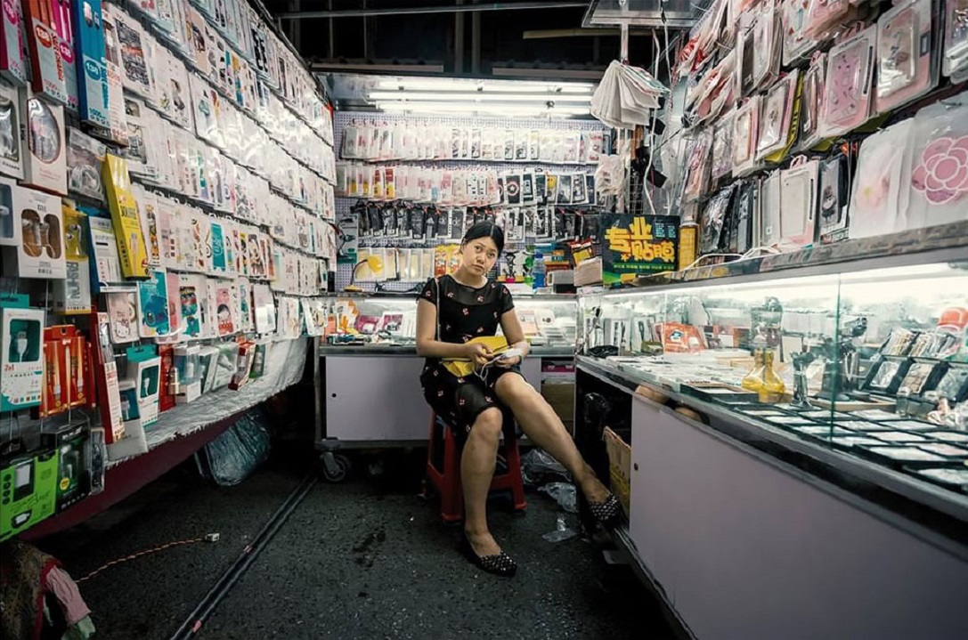 “Burada, Wuhan’daki dairemin çevresindeki alanda, her gece toplanıp sökülen bir çarşıda çektiğim bir seri olan ” Stolen Gun ” üzerinde çalışıyorum. Dar alanlar, dört direk, birçok naylon örtü ve uçuşur gibi görünen dükkanlar gece geç saatlere kadar müşteri almaya hazırdı.”