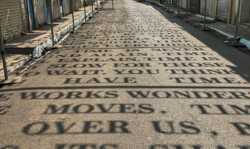 Bu geçici sanat enstalasyonu, caddenin üzerine harflerin gölgelerini serpmek için güneş ışığını kullanıyor ve zamanın geçtiği hakkında bir mesaj görüntüsü ortaya çıkıyor.