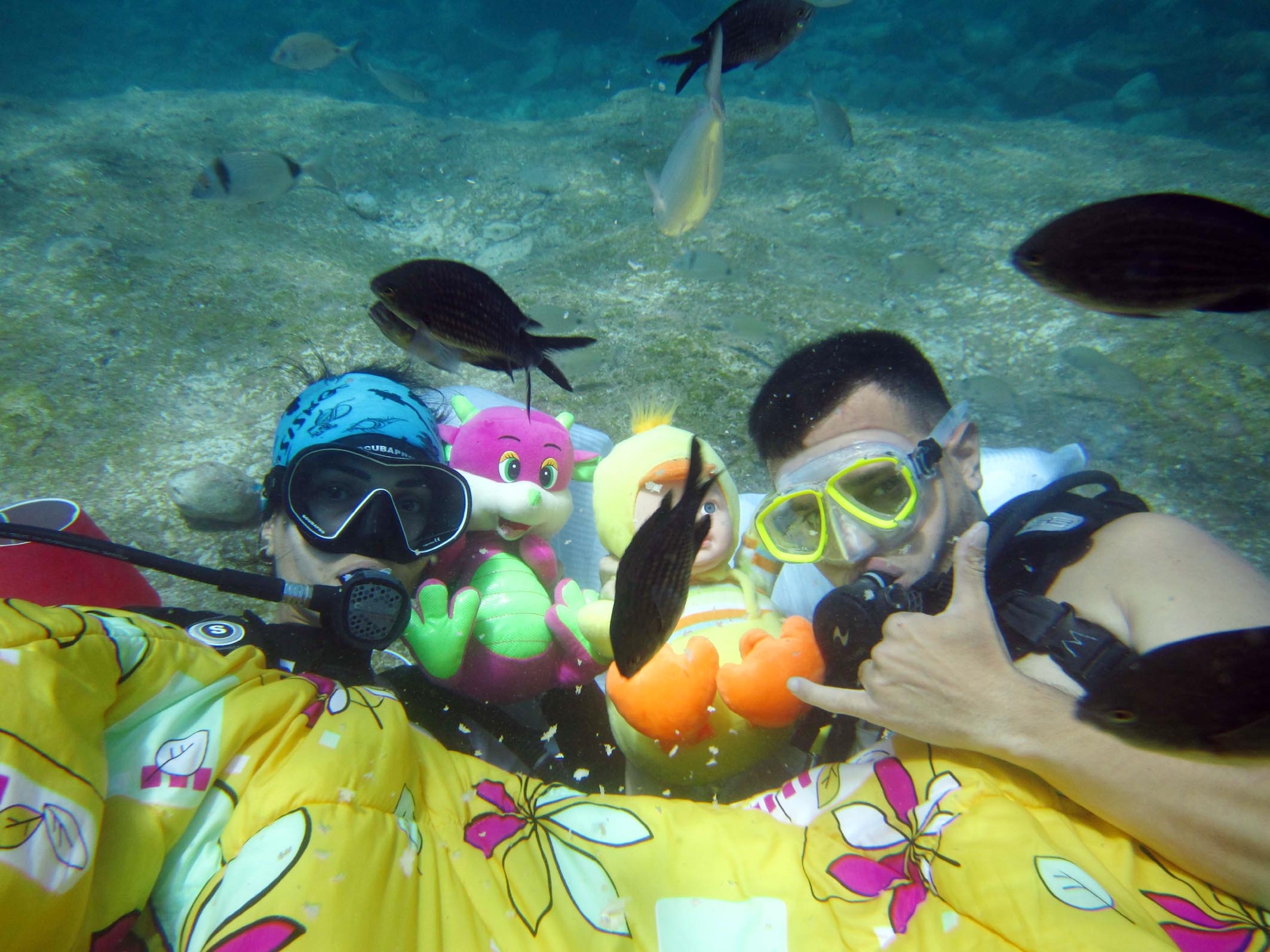 Sualtı canlılarının aile yaşamına dikkati çekmek için harekete geçen Metintürk, Bat ve Diktaş, denizin 8 metre dibine yorgan, yastık, döşek, abajur, saat ve oyuncak bebek indirdi.