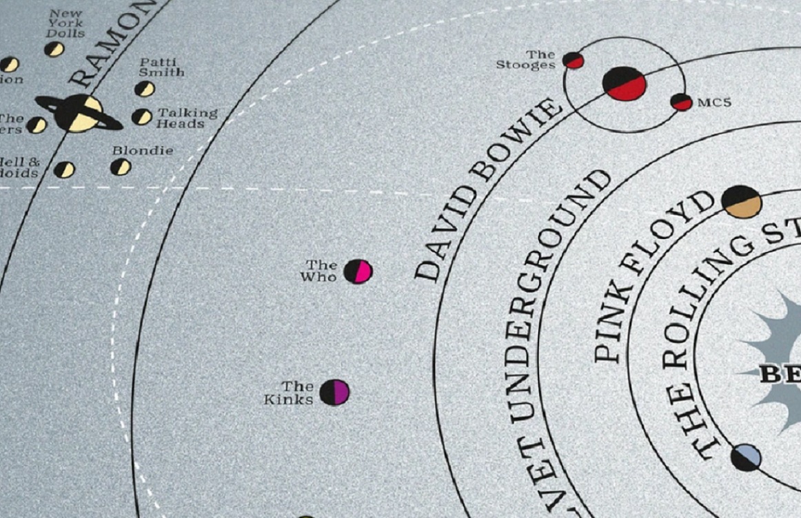 İngiltere merkezli yaratıcı stüdyo Dorothy, güneş sistemini tasvir eden eski tarzda iki baskı yayınladı. Sanat eserleri niteliğindeki haritalarda önemli oyuncular arasındaki güçlü bağlantıları iletmek için güneşi, gezegenleri, ayları ve diğer uyduları elektronik ve alternatif müzik dünyasından grup ve müzisyenlerin adlarıyla değişmiş olarak görüyoruz. Tıpkı gezegenlerin güneşin ve ayların gezegenlerin yörüngesinde dönmesi gibi, yeni güneş sistemi baskıları Kraftwerk, CAN, The Beatles ve The Velvet Underground gibi grupların birbirleri ve onları takip edip aynı stüdyoyu paylaşan grupların sahne üzerinde sahip olduğu devasa çekimin ve etkinin haritasını çıkarıyor. Serinin adı: Across the Universe