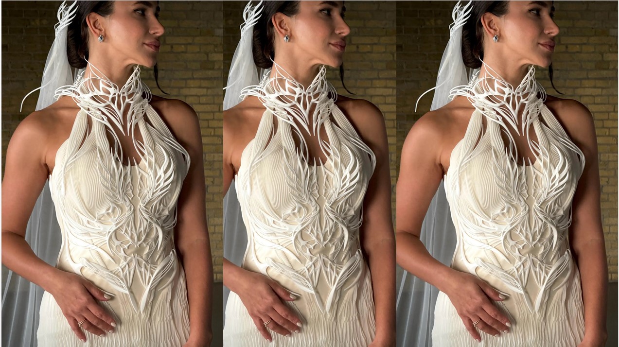 Efsanevi moda tasarımcısı Iris van Herpen tasarımlarındaki şık simetri ve cesur geometrik desenlerle tanınıyor. Beyoncé’den Hunter Schaefer’e, Ali Wong’dan Elizabeth Debicki’ye kadar herkesi giydiren tasarımcı yenilikçi çalışmarıyla sanatçıların favorisi. Ancak ikonik tasarımcı yakın zamanda Mariana Pavani adlı Brezilyalı bir avukat için sıra dışı bir şey yarattı. Gelin adayı avukat düğününde mükemmel görünümü elde etmek için van Herpen ile çalıştı. Sonuç; fütüristik desenli, cesur dekolteli yakalı ve muhteşem dantel kuyruklu, 3B baskılı güzel bir gelinlik oldu. Elbisenin tamamlanması 41 saatlik baskı süresi de dahil olmak üzere 600 saat sürdü ve sonunda Pavani tarafından giyilinceye kadar birkaç kez tekrarlandı. Süreç 3 boyutlu vücut taramasıyla başladı ve ardından elbisenin Paris’teki özel bir tesiste bir araya getirilmesinden önce çok sayıda kişiye özel prova yapıldı.