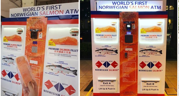 2019 Ocak ayında, Singapur’da bir alışveriş merkezinde yeni bir ATM tanıtıldı. Bu ATM nakit para yerine 200 gram donmuş somon balığı filetosu veriyor.  Bugün, düzinelerce somon ATM’si adanın çeşitli yerlerine dağılmış durumda