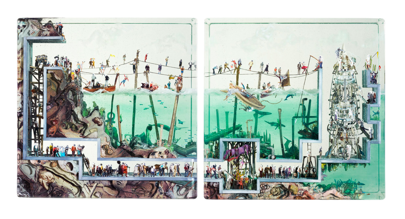 "Group Sisyphus" (2017), Glass, collage, acrylic, resin 16" x 16" x 8"