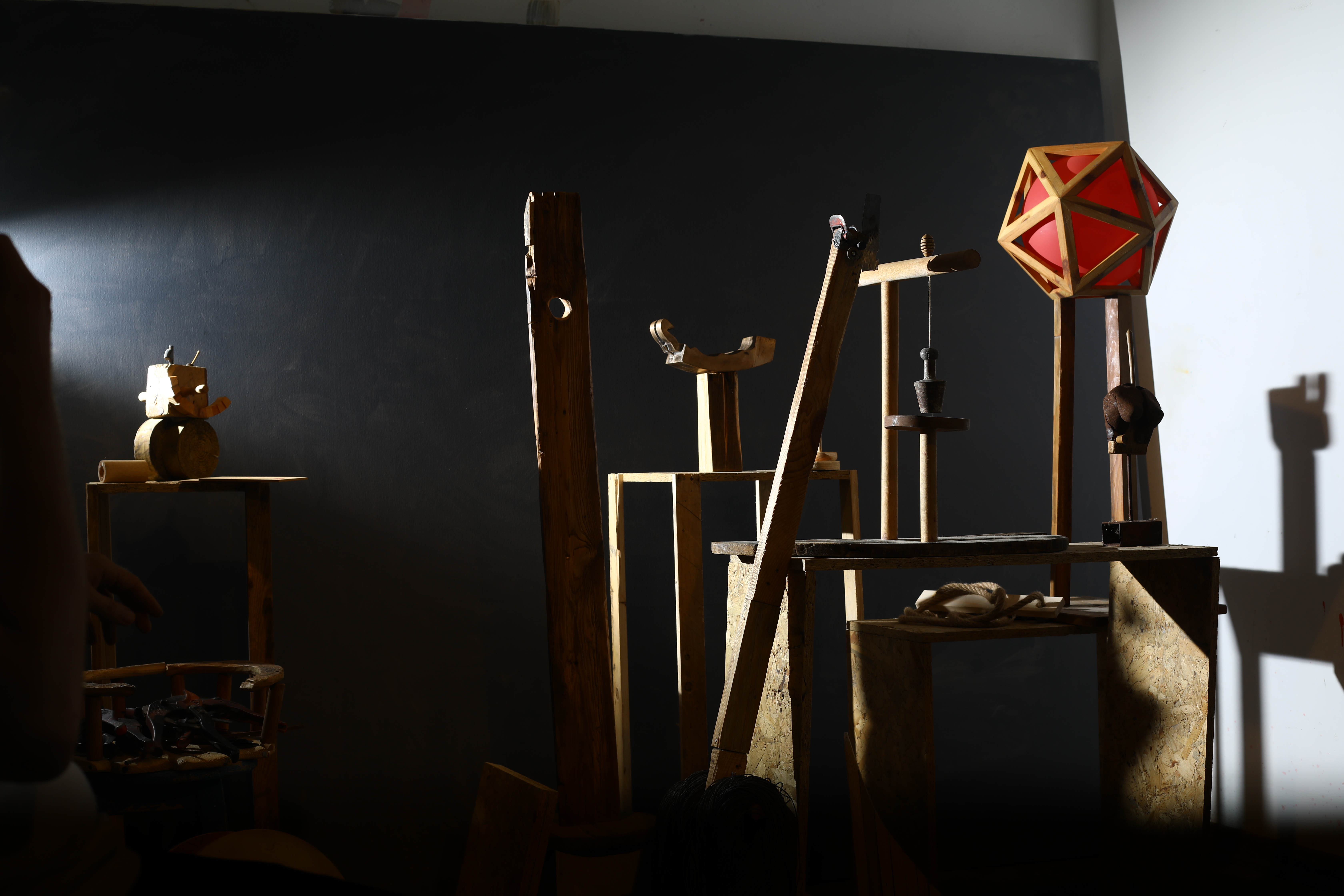 İşte bu çerçeveden bakınca heykel eğitiminden gelen ve tasarımcı olarak sürdürdüğü profesyonel yaşamının son yılında popüler yarışma Survivor için oyun tasarlamakta olan Emre Ezelli’nin sergisine “Bir iki delilik” adını vermesini anlamlı buldum. Ezelli, bu sergide ya güzel bir mesleki deformasyonla, ya içindeki sokak çocuğunu öldürmeyi reddeden yaratıcı bir birey olarak ya da belki her ikisinin toplamıyla, unutulmaya yüz tutmuş anonim oyun ve oyuncak kültürüne odaklanmış. 12 işten oluşan sergide Ezelli arkeolojik kazılarda bulunan, Antik Çağ Anadolu oyuncaklarını ahşap, yorgun metal ve geleneksel dokuma kilim malzemelerini kullanarak bugüne taşımış ve yeniden yorumlamış.