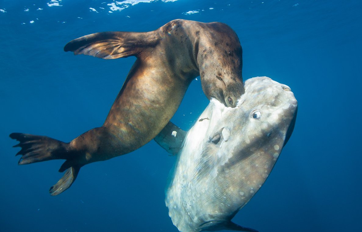 Gerçekte bu fotoğraf çok acımasız bir hikâyeyi anlatıyor. Denizaslanı güneş balığı olarak da bilinen dev Mola Mola’yı yiyor ve fotoğrafta bu dev balığın olması nedeniyle durum sıradışı hale geliyor. Kemikli balıkların son derece sert derili olduğu bilinir. Kavga etmek ve yemek için oldukça zorludurlar. Bu balıklar genellikle bir ton civarında bir ağırlığa sahiptir.