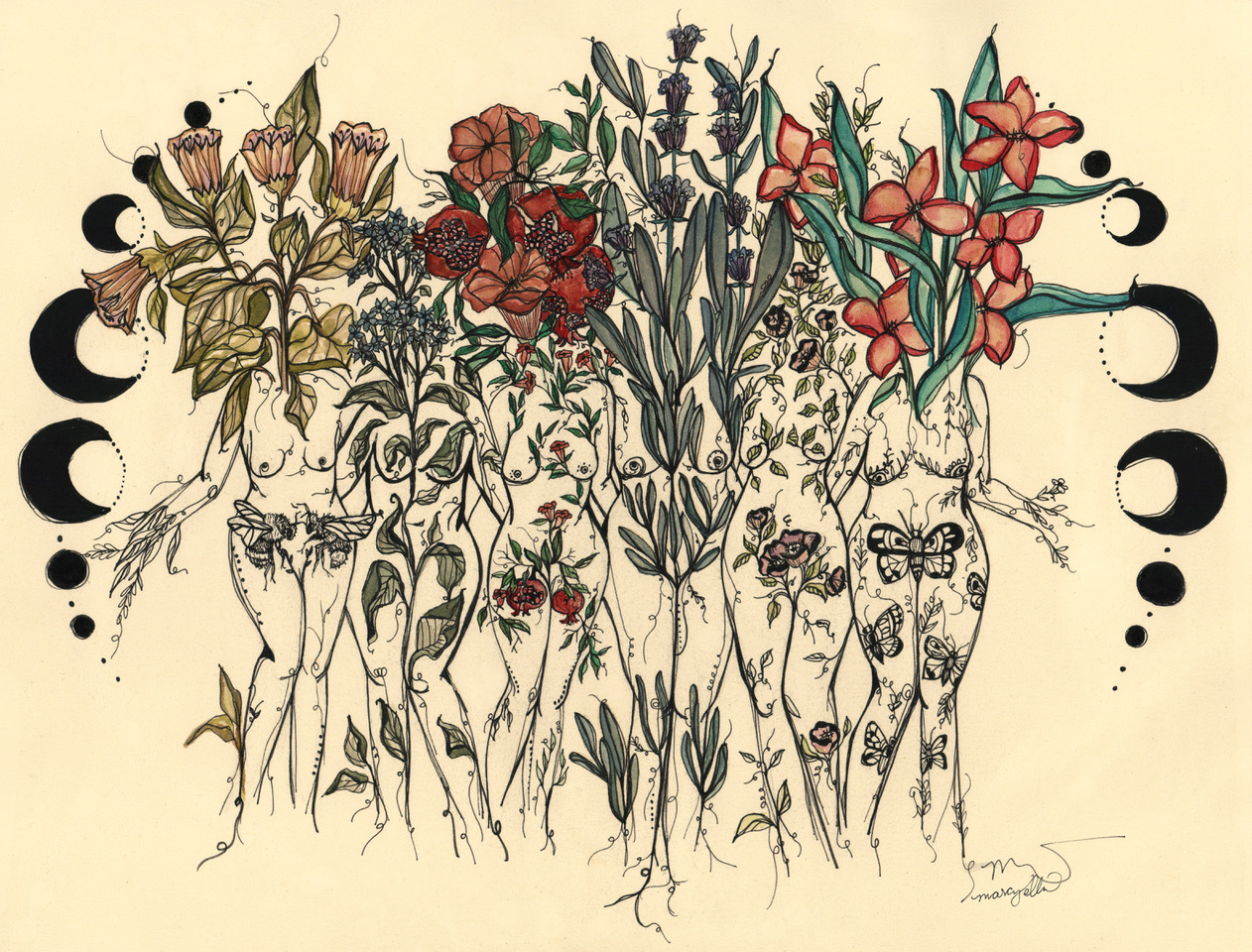 Marcy Ellis, eserlerinde flora, doğal dünya ve kadın formundan ilham alıyor. Sanatsal evreni, dişi vücudu çiçekler, bitkiler, yapraklar ve köklerle kaplı, alışılmadık ve büyüleyici bir botanik tanrıça olan “botanik figürlerden” oluşuyor. Sanatçının “Flora Sisters” adını verdiği ve “hayatın gerçeküstü bir kutlaması” olarak gördüğü çok şiirsel ve mistik bir çalışma. Şu anda Sonoran Çölü’nde yaşayan Marcy, sanatı tam zamanlı olarak anlatıyor ve öğretiyor.