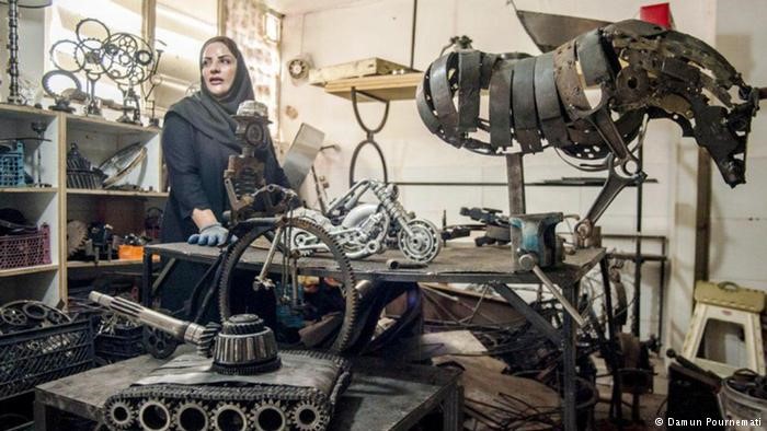 Fatemeh Safarpour’un sanat tutkusu mesleği haline gelmiş. İşe birkaç yıl önce hurda metalleri birbirine kaynak yaparak küçük sanat nesnelerine dönüştürerek başlamış. Bunu geliştirerek küçük bir atölye kurmuş ve mesleğine otomobil hurdalarıyla başlamış.