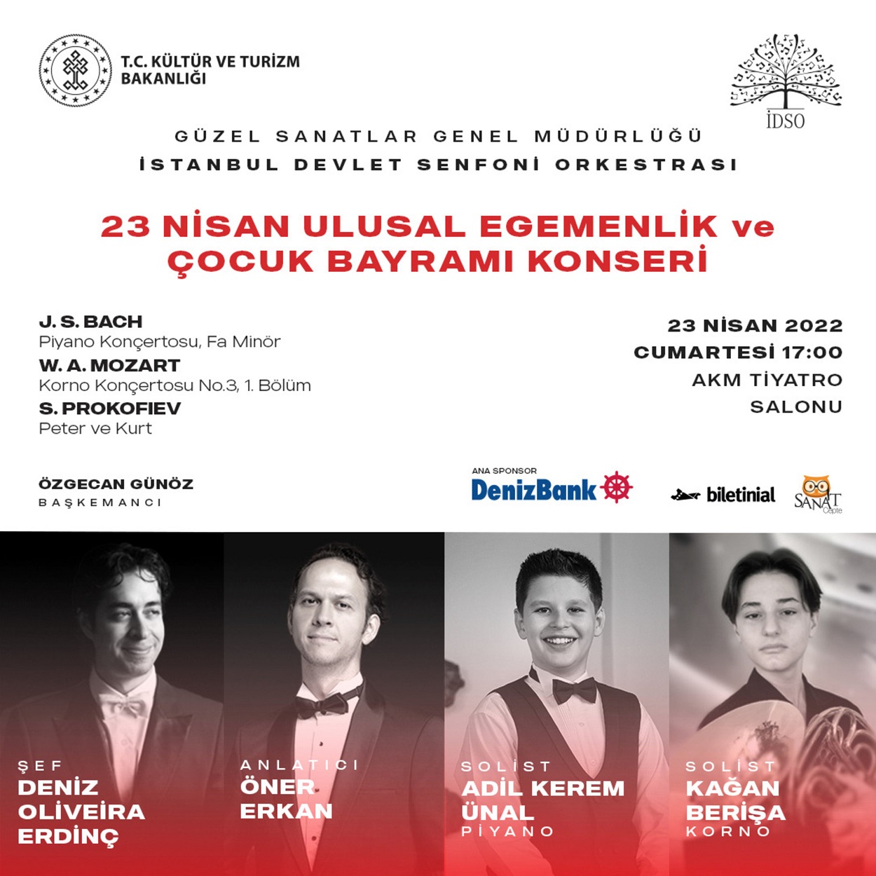 İDSO DenizBank “Ulusal Egemenlik ve Çocuk Bayramı Konseri”; 23 Nisan 2022 Cumartesi saat 17.00’de İstanbul AKM Tiyatro Salonu’nda gerçekleştirilecek. 18-23 Nisan tarihleri arasında AKM Çocuk Sanat Festivali kapsamında düzenlenecek konseri; müzisyen bir ailede yetişen ve müzik hayatına Bilkent Gençlik Senfoni Orkestrası’nda asistan şef olarak devam eden genç ve başarılı şef Deniz Oliveira Erdinç yönetecek.