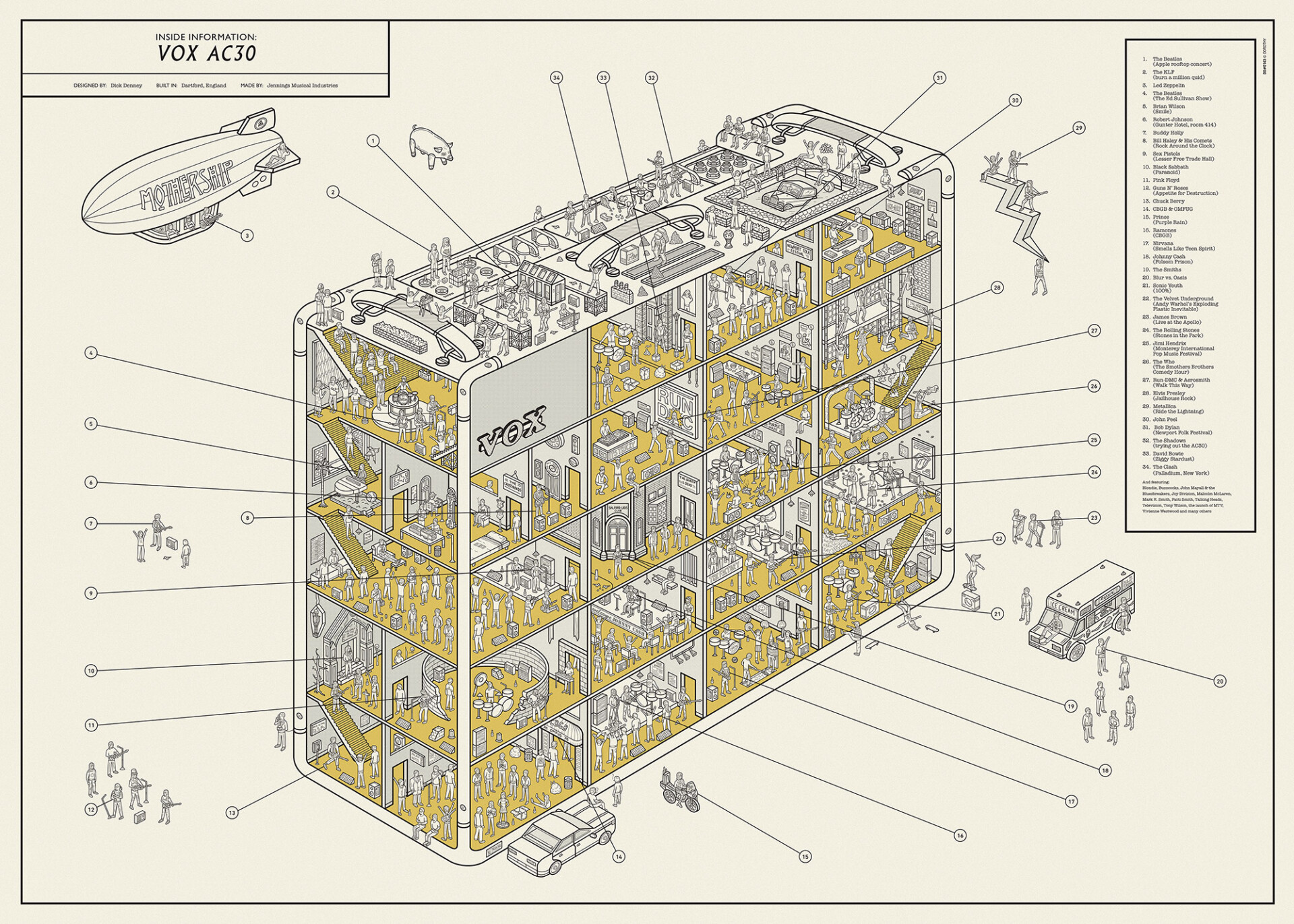 İngiltere merkezli tasarım stüdyosu Dorothy, Inside Information adlı devamlılığı arz eden bir seriye dahil olan akıllı “kesit” infografikler aracılığıyla film, müzik, kişisel bilgisayar ve moda alanlarındaki en ikonik tasarımlardan bazılarını araştırıyor. Her çizim, Vox AC30 amplifikatörü kullanan ünlü konserlerden sinemayı sonsuza dek dönüştüren Arriflex 35 IIC el kamerasını kullanılan filmlere kadar tarihsel anlarla dolu minyatür bir izometrik dünyayı ortaya koyuyor.