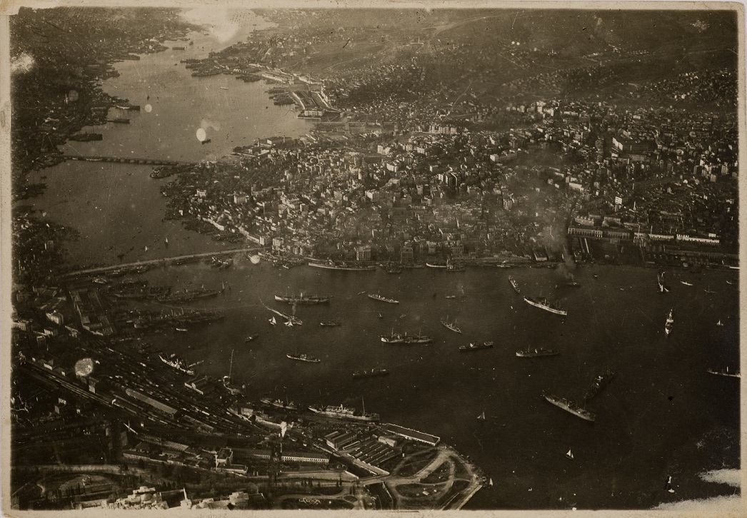 GÖRSEL: İşgal donanmasını Haliç girişinde gösteren hava fotoğrafı, 3 Ağustos 1919. Suna ve İnan Kıraç Vakfı Fotoğraf Koleksiyonu.
