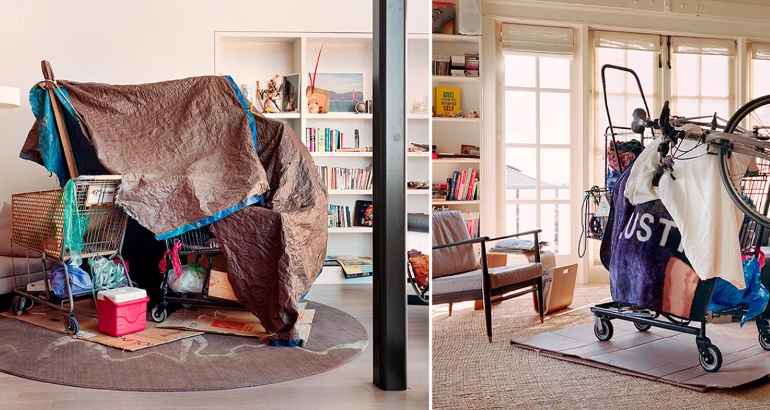 Alman fotoğrafçı Jana Sophia Nolle, San Francisco’daki evsizlerin geçici barınaklarını yeniden inşa etti ve zengin insanların oturma odalarına yerleştirdi. Proje bizden sosyal soru ve bağlantıları, insan etkileşimlerine dayanmayan, tamamen maddi bir perspektifle ele almamızı istiyor.