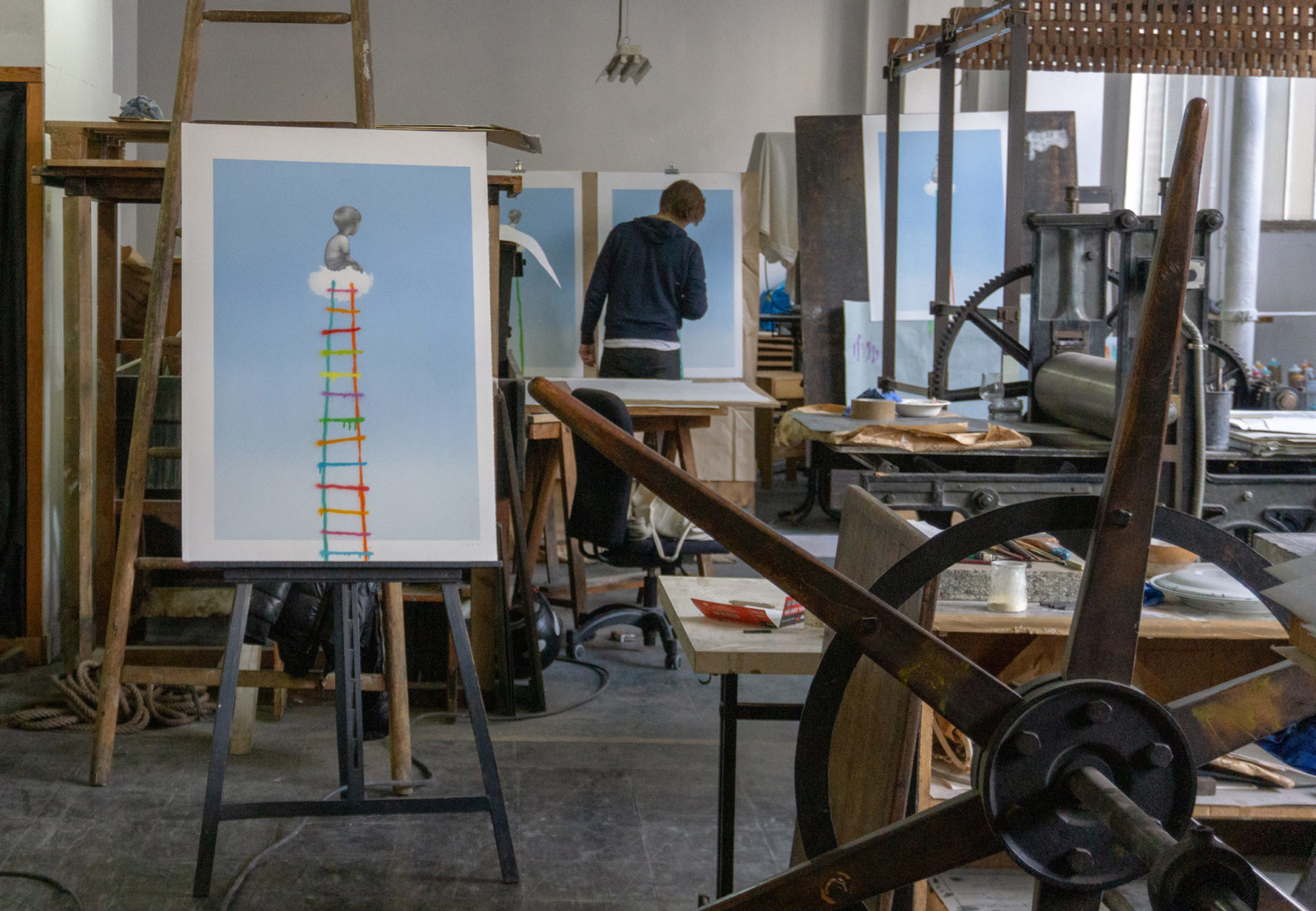 Malland, son zamanlarda, baskı hassasiyetini genellikle dağınık sprey boyayla kaynaştıran bir litograf baskı tekniği kullanıyor. “Ladder” başlıklı parçada, uzağa bakan, tek bir bulutun tepesinde oturan bir çocuk var.