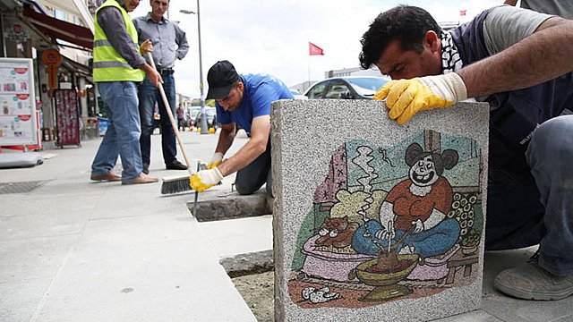 Kaldırımlara usta şairlerin dizelerini yazan Kadıköy Belediyesi şimdi de karikatür kahramanlarını kaldırımlara taşıdı.