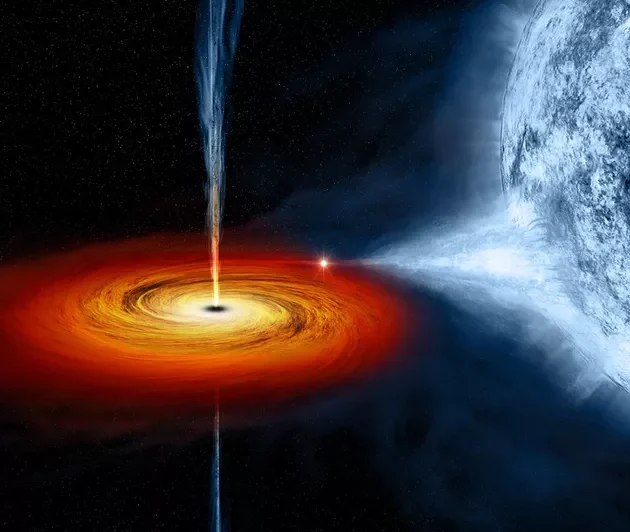 görsel: Cygnus X-1’in bir sanatçının elinden tasviri, yakındaki bir yıldızdan maddeyi kendi birikim diskine çeken ve giren aşırı ısınmış gazlardan radyasyon yayan yıldız kütleli bir kara delik. Cygnus X-1 keşfedilen ilk kara delikti. NASA/CXC/M.Weiss/Wikimedia Commons