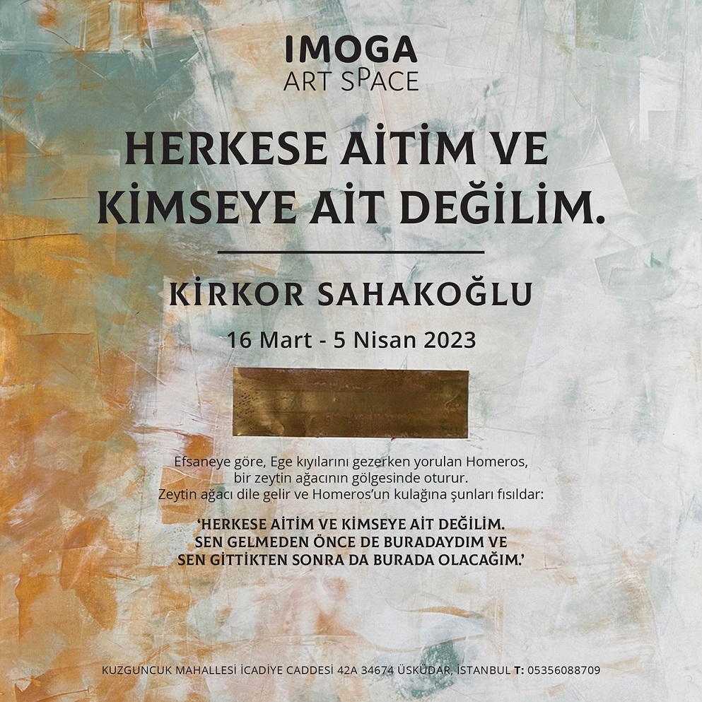 Kirkor Sahakoğlu’nun yeni sergisi “Herkese Aitim ve Kimseye Ait Değilim”, IMOGA Art Space’te açıldı. 5 Nisan’a dek devam edecek olan sergi, sanatçının son dönem çalışmalarını bir araya getiriyor.