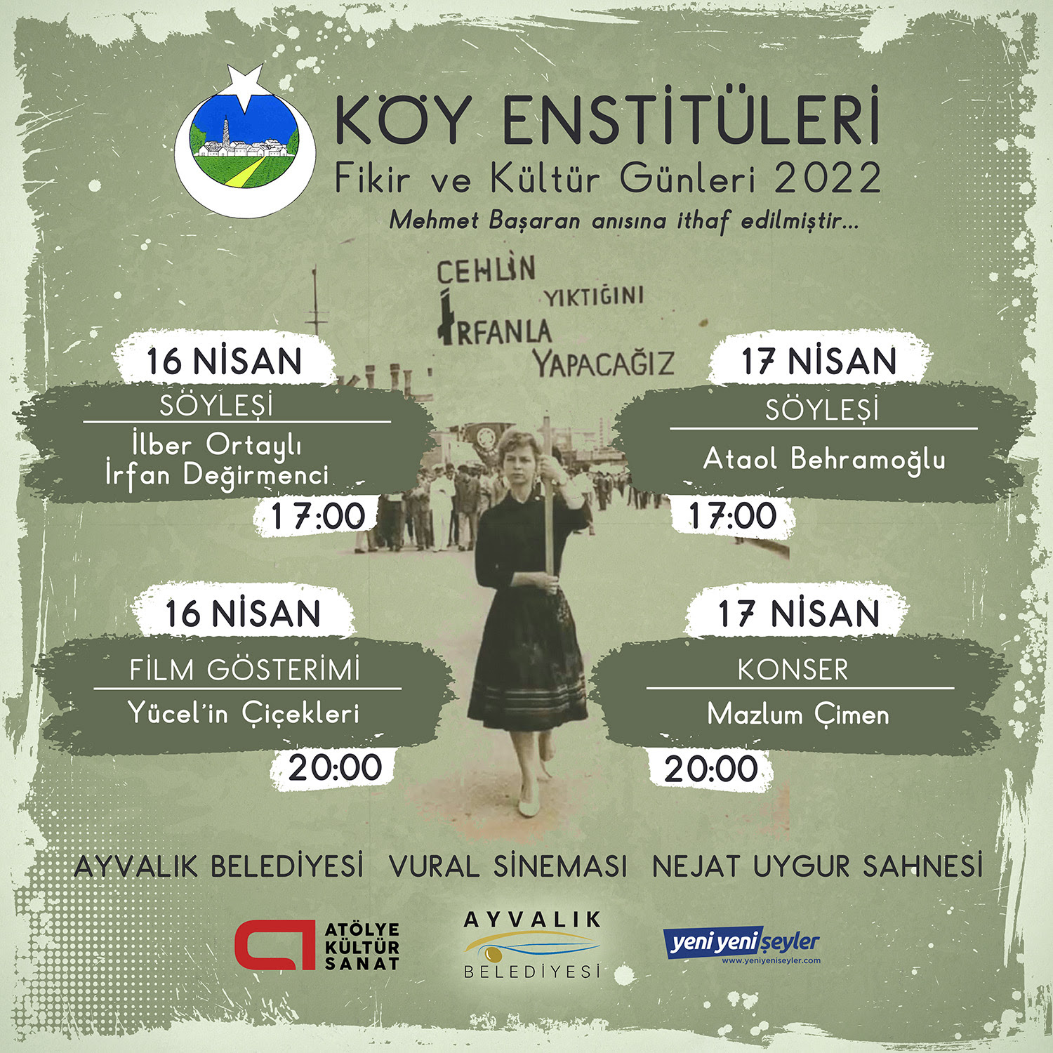 Geçtiğimiz yıl Atölye Kültür Sanat organizasyonu ve Ayvalık Belediyesi ev sahipliğinde ilki yapılan Köy Enstitüleri Fikir ve Kültür Günleri, Köy Enstitülerinin 82. kuruluş yıldönümü olan 16 -17 Nisan 2022 tarihlerinde Ayvalık’ta ikinci kez düzenlenecek. Türkiye’de Köy Enstitüleri ile ilgili düzenli olarak yapılan tek etkinlik dizisi olan organizasyonda bu sene de ülkenin önde gelen tarihçi, yazar ve sanatçıları Ayvalık’ta iki gün boyunca Köy Enstitülerini yine gündeme taşıyacak.