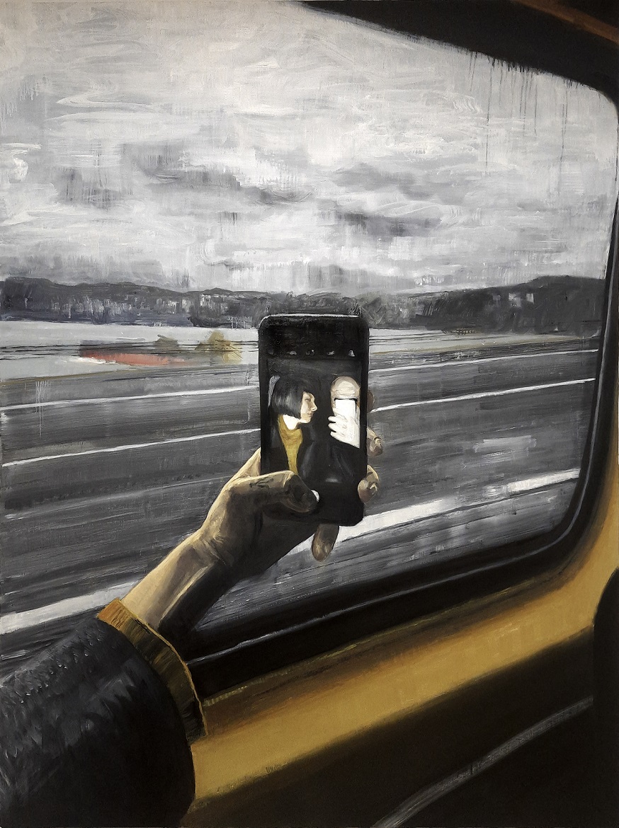Beler, bir simyacı gibi sıvı kristal ekranlarımızdan akan metaforik ve pek de geçici olmayan atomları titreştiriyor, onları ekrandan çekip havaya doğru uzatıyor, tuvalin fizikselliğine taşıyor. Bu üç boyutlu, dokulu ve katmanlı çerçevede karşımıza fotoğrafı çeken ekranın başka bir LCD ekrandaki yansıması bile çıkabiliyor. LCD’nin ışıklı yansımasından, tuvalin üzerindeki fırça izlerine, her iki çerçevenin de tuttuğu, geçmiş ve geleceğinin bütün potansiyellerini görünür kılıyor.