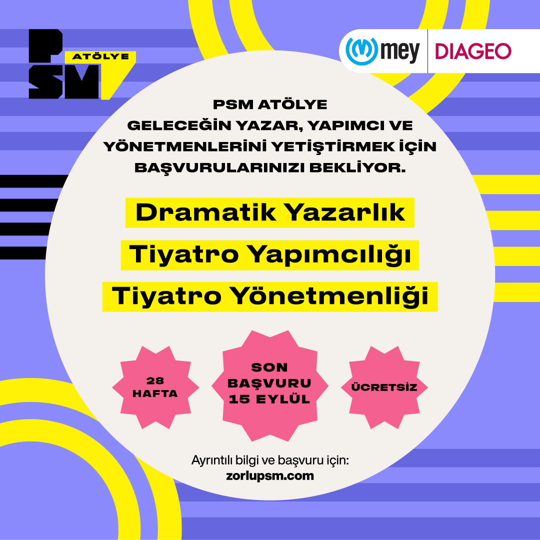 Kültür sanata sürdürülebilir destek sağlamayı görev bilen Mey|Diageo ile Zorlu PSM’nin, tiyatroya yeni yetenekler kazandırmak amacıyla birlikte sürdürdüğü PSM Atölye’ye kayıtlar devam ediyor!