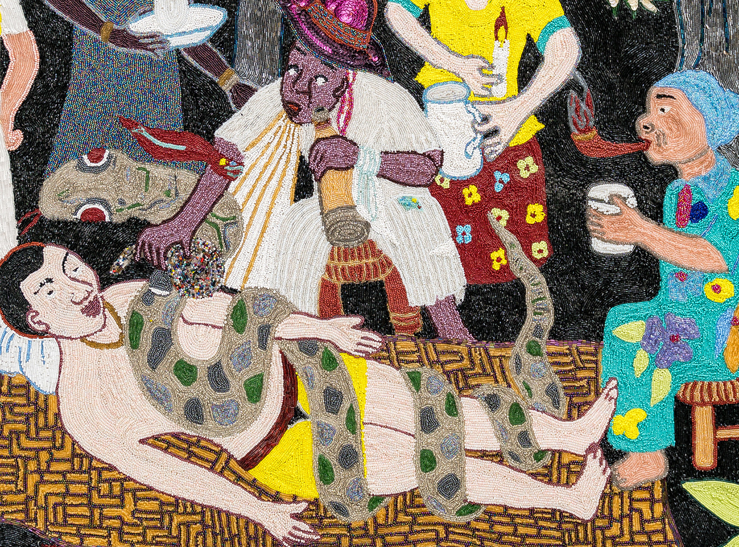 Boncuk işi sanatçısı Myrlande Constant, yaklaşık 30 yılını karmaşık sanatını geliştirmeye çalışarak geçirdi. Genellikle altı ya da yedi aya kadar uzanan büyük ölçekli eserler, soyut desenlerin ve sembolik nesnelerin boncuklu bir “çerçevesi” ile çevrili dini, tarihi ve mitolojik sahnelerden oluşuyor. Sanatçi Port-au-Prince, Haiti’de yaşamaya ve çalışmaya devam ediyor. Sanatçı, boncuk sanatını yerel bir gelinlik üreticisinde fabrika işçisi olarak çalışan annesinden öğrendi. Fabrikada boncuk işinden voodo flamaları yapan birkaç kadın da vardı.