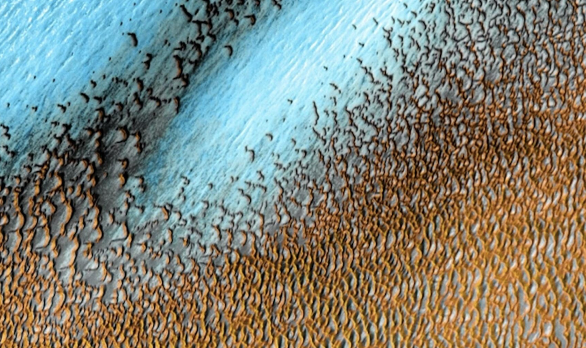 Mars Odyssey tarafından çekilen çok çarpıcı yeni bir görüntü, Kızıl Gezegen ile eşanlamlı olan pas rengi, engebeli manzarayla tam bir tezat oluşturuyor. Geçen hafta NASA tarafından paylaşılan sahte renkli kompozit – Aralık 2002 ile Kasım 2004 arasında çekilmiş bir yama çalışması – nispeten küçük gezegenin kuzey kutup dairesini çevreleyen uzun kumulları ortaya çıkarıyor. Güneşin dokunduğu daha sıcak alanlar altın bir parıltı yayarken daha soğuk kısımlar mavi renkte. Görüntü, sadece 30 kilometrelik bir arazideki kum tepelerini çerçeveliyor, ancak dalgalı desen Teksas büyüklüğünde bir alanı kaplıyor.