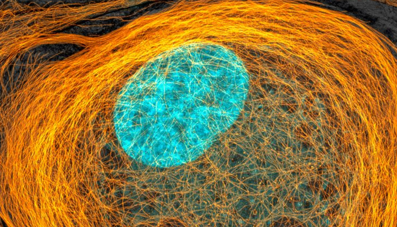 Microtubules (orange) inside a cell. Nucleus is shown in cyan.