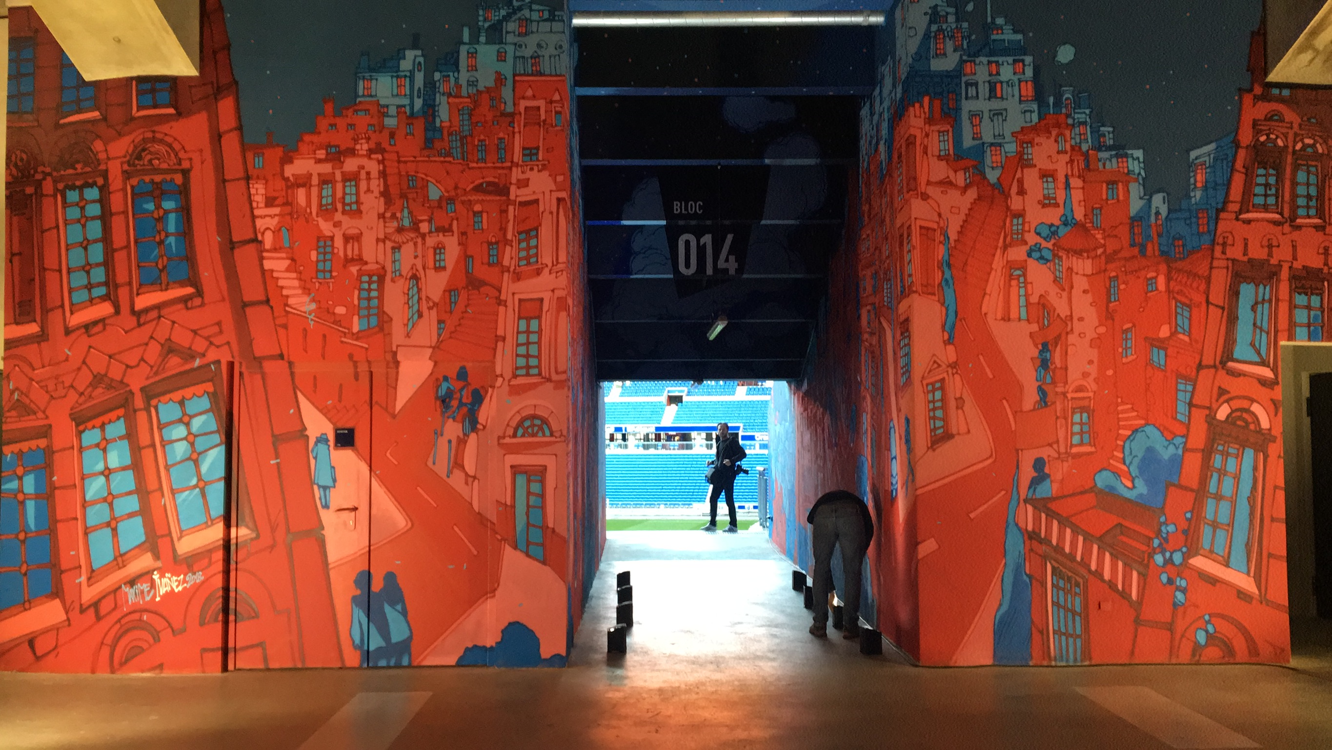2016’daki açılışından bu yana Groupama Stadyumunda sıra dışı ve göze hoş gelecek bir şey yoktu. Birçok taraftar, “Işıklar Stadyumu” nun sadece gri duvarlara sahip olduğunu söylüyordu. Bu monotonluk içsel olarak da bir problemdi ve futbol dışı etkinlikler – konser, seminer vb. – içinde kullanılacak bir mekân için fazla renksizdi. Kulübün iki çalışanı, bu sorunu ele alıp stadyumun duvarlarını resmetmesi için Birdy Kids ile irtibata geçmesi yönünde Stadyumu Müdürü Xavier Gardrot’ya teklif götürdü. Birkaç hafta sonra proje doğdu, Guillaume ve Gauthier Mathieu, Groupama Stadyumu’nun güneybatı bölümünü resimleri çizmek için biraz daha açık bir renge boyadı.