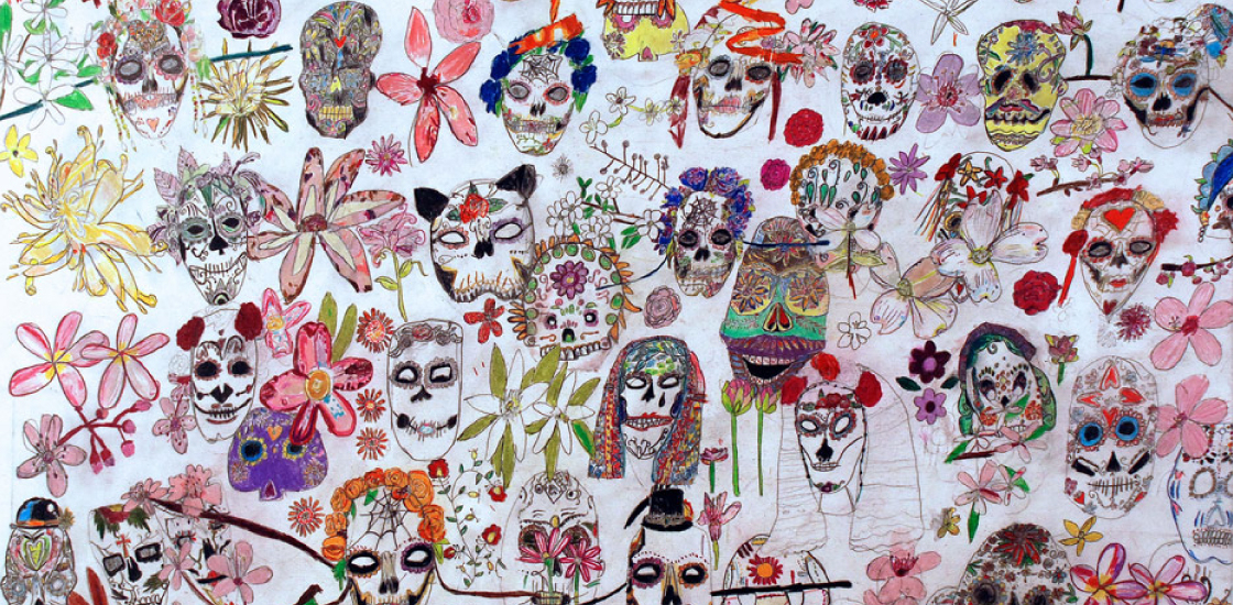 Nicole Appel, Pembe Flamingolar ve Timsahlar, kâğıt üzerine renkli kalem, 19 “x 24”, 2014