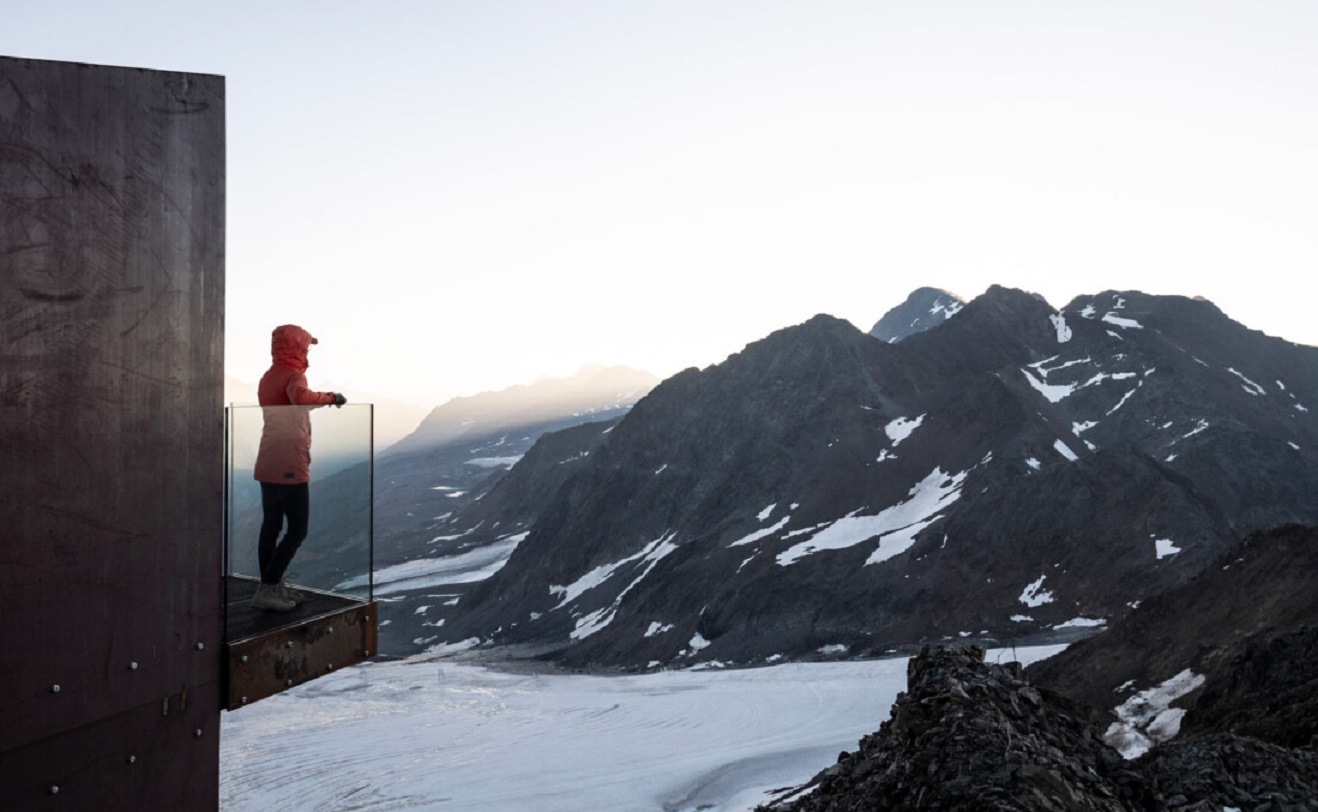 Network of Architecture yapıyı, zamanla malzeme değiştikçe çevresini estetik olarak yansıtacak ve uyum sağlayacak ayrışma çeliğinden inşa etti. Platform titizlikle tasarlandı; sadece gerektiği kadarının yerle teması var ve buzulun kenarına tüneme hissi vererek ziyaretin yaşattığı duygulara katkıda bulunuyor.