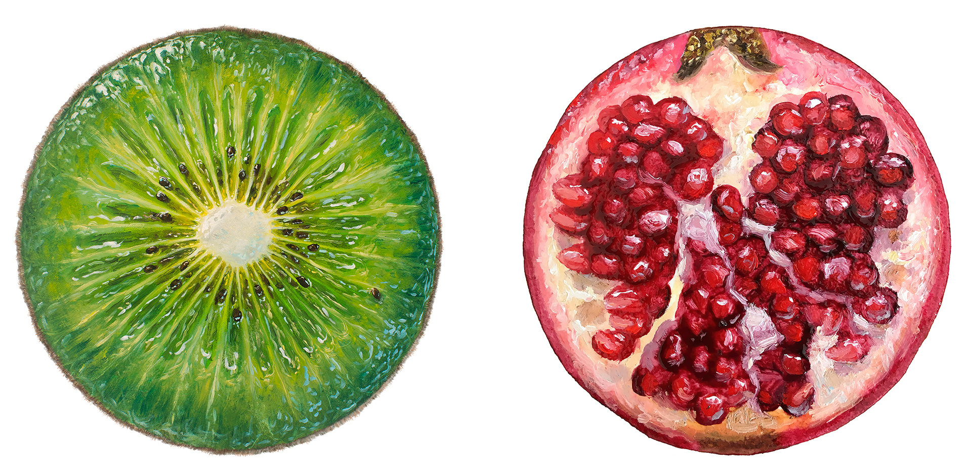 Çeşitli çaplarda yuvarlak tuvaller kullanan Alonsa Guevara, portakal, karpuz ve diğer meyvelerin dolgun, sulu iç kısımlarını ustaca boyuyor. Her dairesel parça, taze ürünlerin içinde bulunan lifli damarları ve merkezi tohumları yakalayarak mükemmel görünen bir dilimi tasvir ediyor.