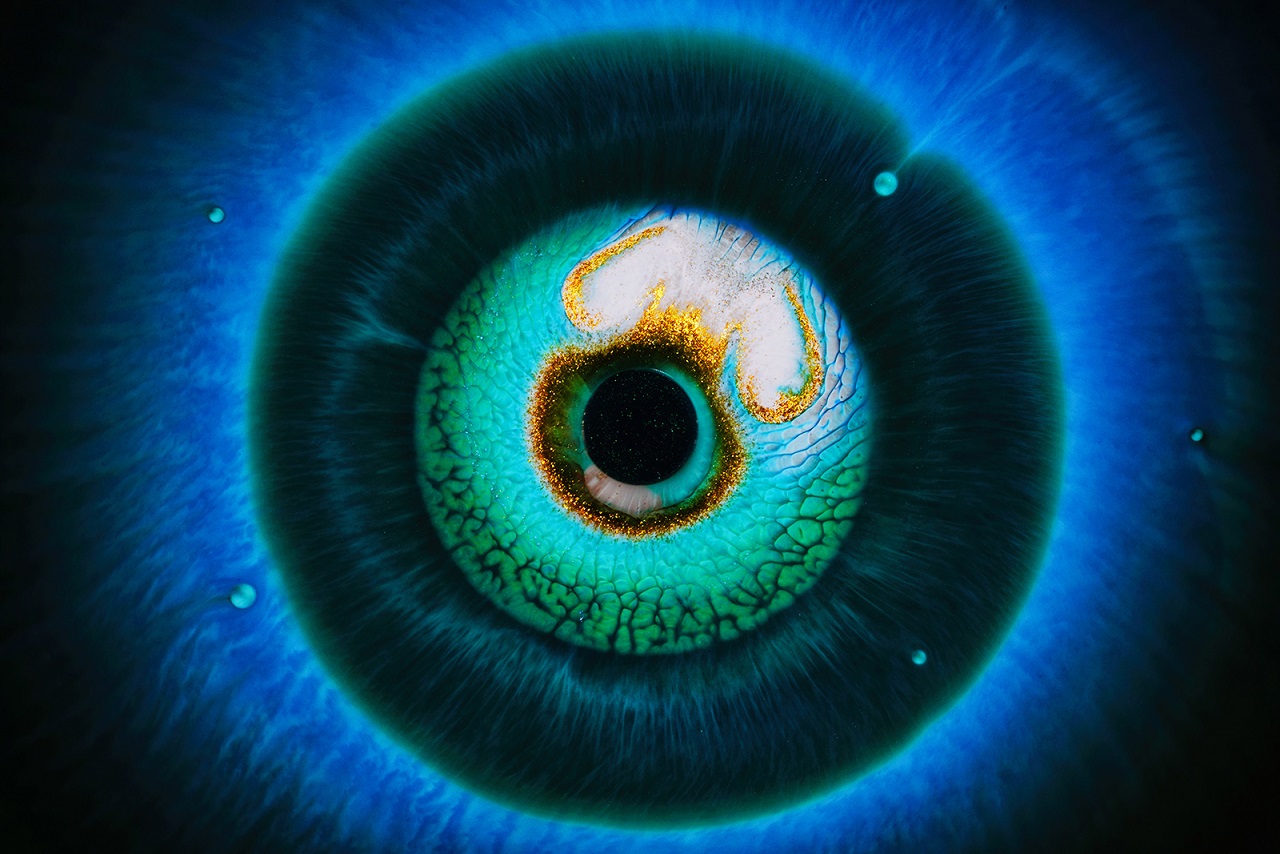 Parıltılı, mürekkep gibi sıvılar ekranda dolaşıyor ve insan gözünün büyütülmüş çekimlerini taklit eden bir dizi baloncuğa dönüşüyorlar. Hipnotik görüntüler, bir kişinin irislerinin çok renkli olduğu, bazen göz bebeğinin etrafına yayılan sivri uçlar ya da dokuyu farklı tonlarla bölen girdaplar şeklinde oldukça yaygın bir durum olan heterokromia iridum’a atıfta bulunurken pareidolia’yı kullanır. Khasanov’un yorumu, söz konusu fenomeni doymuş damlacıklar ve dışarıya doğru yayılan sayısız damarlar aracılığıyla taklit etmek biçiminde.