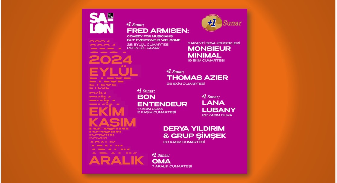 Salon’un +1 ve Garanti BBVA’nın destekleriyle yıl sonuna kadar ağırlayacağı isimler arasında kökleri Filistin’e uzanan, günümüz avant-pop sahnesinin en ilginç sanatçılarından Lana Lubany;yılın keşfi olmaya aday İngiliz dörtlü OMA; Yunanistan’ın güncel indie-pop öncüsü Monsieur Minimal;elektronik müzikle tutku dolu ilişkisini her notasında hissettiren Hollandalı müzisyen Thomas Azier vegüneşli, hedonist Fransız Rivierası’ndan Bon Entendeur yer alıyor. Bağlamacı ve multi-enstrümantalist Derya Yıldırım’a dünyanın dört bir yanından müzisyenlerin katıldığı saykedelik müzik kolektifi Derya Yıldırım & Grup Şimşek de Salon’un sonbahar programında.