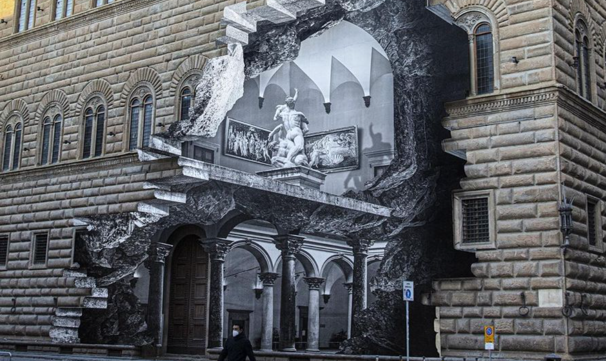 İtalya’da pandemi sebebiyle kapanma devam ederken Fransız sanatçı JR, Floransa’daki Palazzo Strozzi’nin cephesinde halk sağlığı krizi sırasında kültüre erişimin sürdürülmesinin önemini vurgulayan büyük bir enstalasyonun açılışını yaptı.