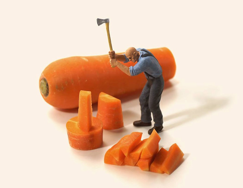 Tanaka, ofis araç gereçleri, gıdalar ve bulduğu diğer nesneleri kullanarak minyatür dünyasının sakinleri için arka planlar oluşturuyor.